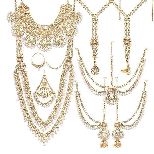 • QUANTITY: 1 Choker, 1 Long Necklace, 1 Pair of Earrings, 1 Mathapatti, 1 Nath/Nose Ring, 1 Passa, 2 Panja