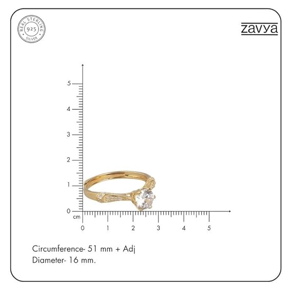 • Product Details: Made of pure 925 Sterling Silver, this Cubic Zirconia studded Solitaire 2.01″ + Adj. Women Ring is an exclusive piece from Zavya’s Gold Plated collection.